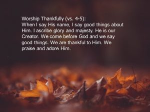 There is way to come to church and worship the God of all joy. There is an attitude of heart that is essential. This Psalm is powerful and forms the basis for a hymn, “All people that on earth do dwell.” This Psalm speaks to the way we need to worship and the worship we need to offer this great, joyful God. This Psalm calls us to be a happy people serving a happy God. This is a hymn or Psalm of thanksgiving, a call to praise God. God is not addressed in the Psalm. This Psalm addresses the worshipper. It addresses how we should worship. It addresses how we should enter His presence. Praise toward God produces edification. This Psalm is so beautiful and powerful that its message is timeless.
