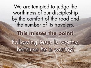 Like this student, we are tempted to judge the worthiness of our discipleship by the comfort of the road and the number of its travelers. This misses the point! Following Jesus is worthy, because he is worthy! Discipleship is not about crowds, but Christ. The places Jesus leads us will sometimes be lonely and rough, but they are worthy because he is there.
