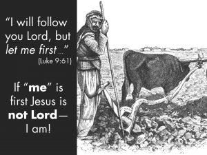 Excited by the Lord’s invitation a third person yelled, “I will follow you Lord, but let me first say farewell to those at my home” (Luke 9:61). The irony in this statement is laughable if it weren’t so sad, “Lord, let me first.” If “me” is first Jesus is not Lord—I am! Jesus sees a danger in the man’s request and points to the field.