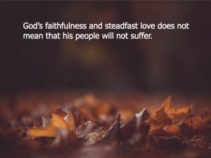 God’s faithfulness and steadfast love does not mean that his people will not suffer. David suffered and Jesus suffered. God’s faithfulness and steadfast love means he will get you through your suffering. He will never leave you or forsake you. Turn to him, trust him, and look for him to respond with steadfast love in your life.