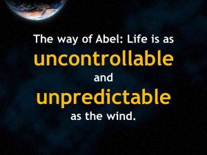 This is why the author of Ecclesiastes uses Abel’s name 37 times to describe the nature of life (translated as, “vanity” or “meaningless” see Eccl. 8:14). Understanding and controlling life is like trying to shepherd the wind—an impossible task. At the end of the day “our projects are cloud castles on a windy day” (Leithhart, Solomon Among the Post-moderns. p. 68).